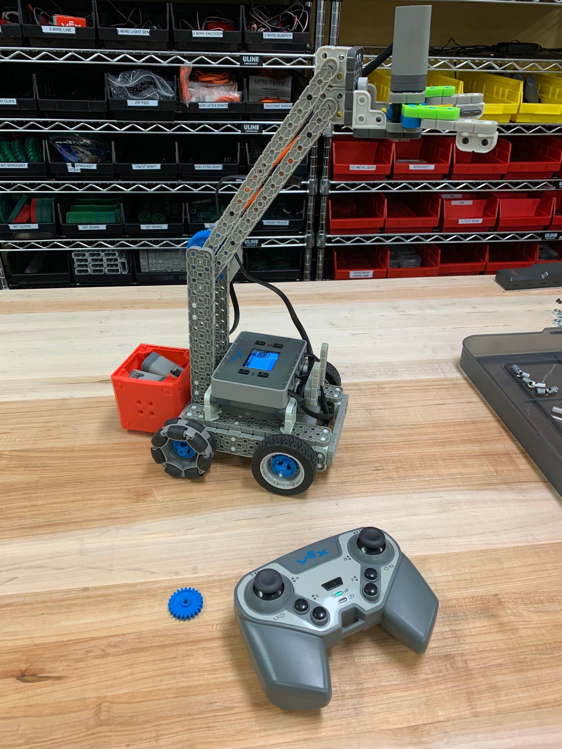 Next, we added another axle to the front of the robot in addition to makeshift wheels, to prevent tipping when coming to a stop. The next modification I’d want to make is reinforcing the arm tower, to prevent sway when turning at height.