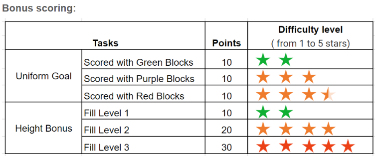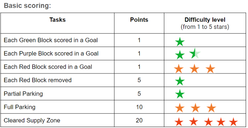 We can start by selecting some easy tasks strategically to complete while making sure to obtain Uniform and Height Bonuses to maximize our scoring. For example, we can opt to complete the scoring combination illustrated in Goal Scoring Example 1, remove three Red Blocks, and accomplish partial parking. By doing so, we can attain a total of 66 points!