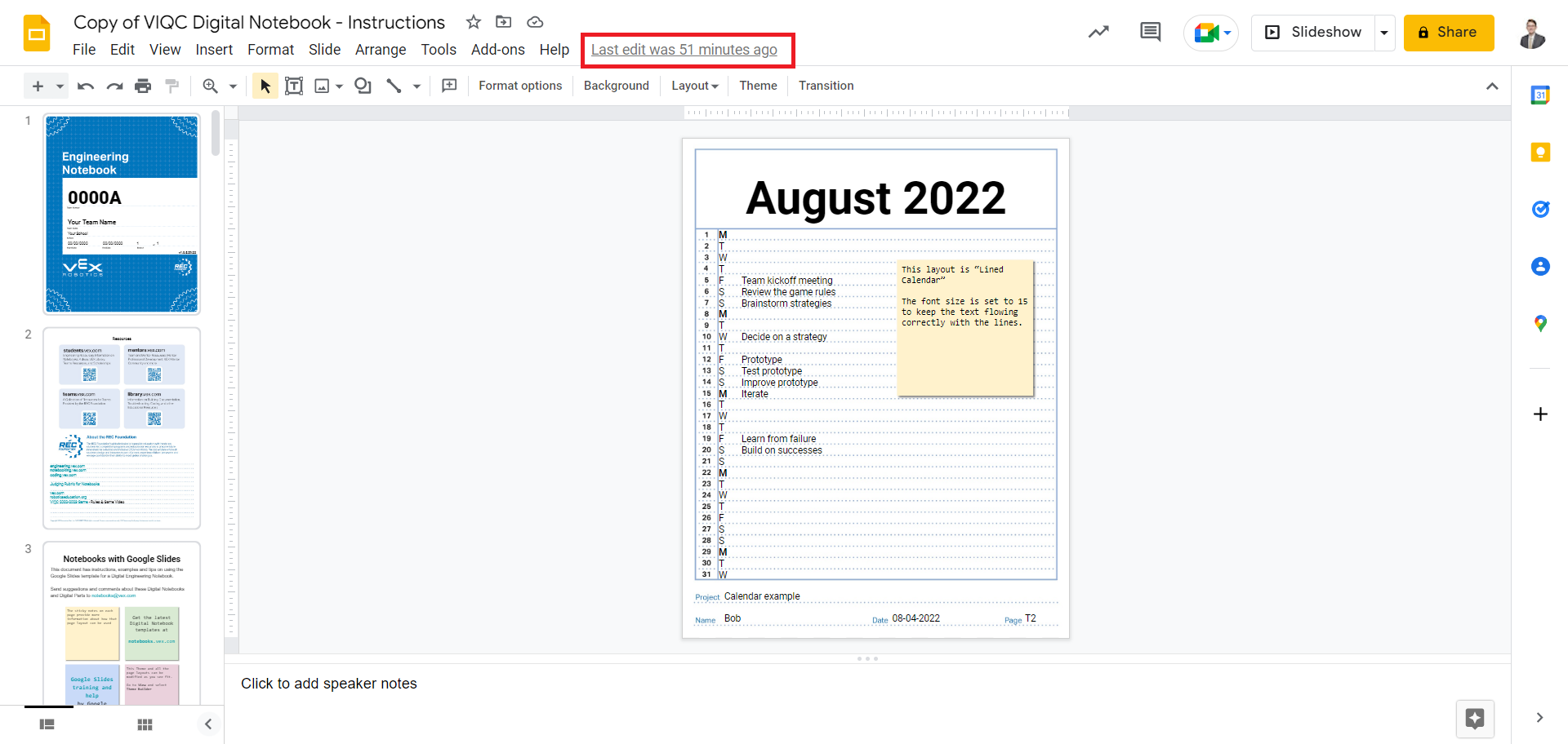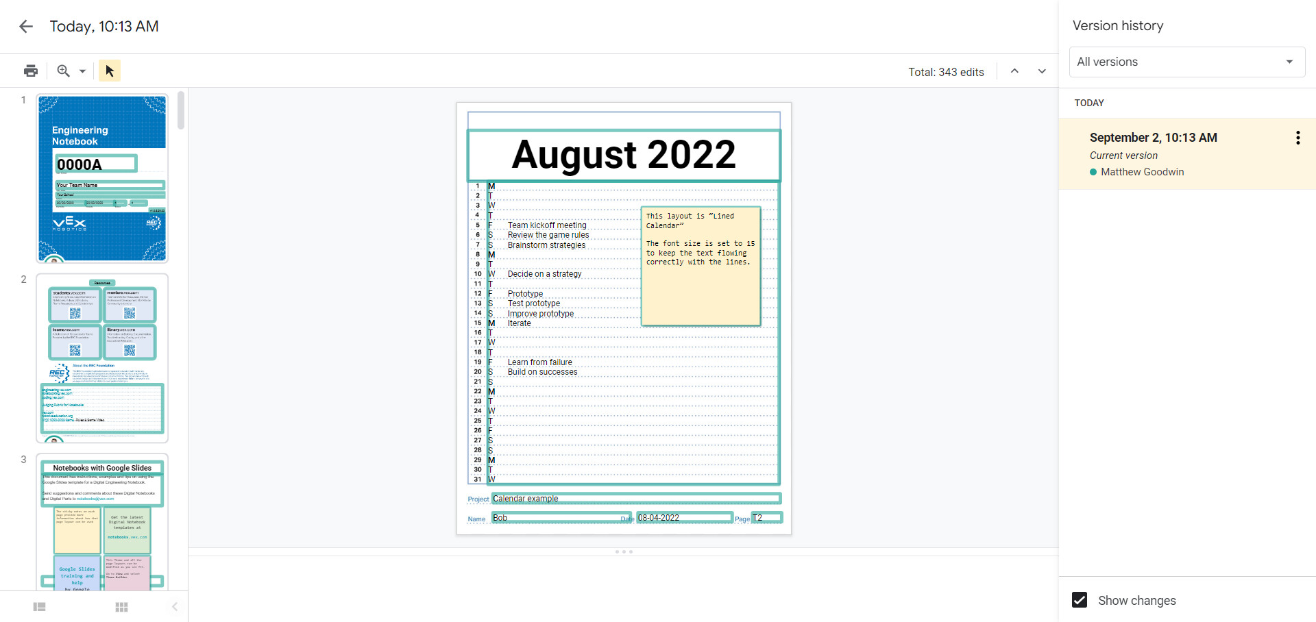 Once that is all said and done, Google Slides (definite) and Microsoft PowerPoint (I think) also generate a Version History and log when and what changes were added or removed from the digital notebook. Do not only rely on this however as judges look for the timestamp at the bottom of each appropriate pages. It is a useful resource to see what, when, from who, and how much was added (shown in the image below) in case you forgot to sign and date that page.