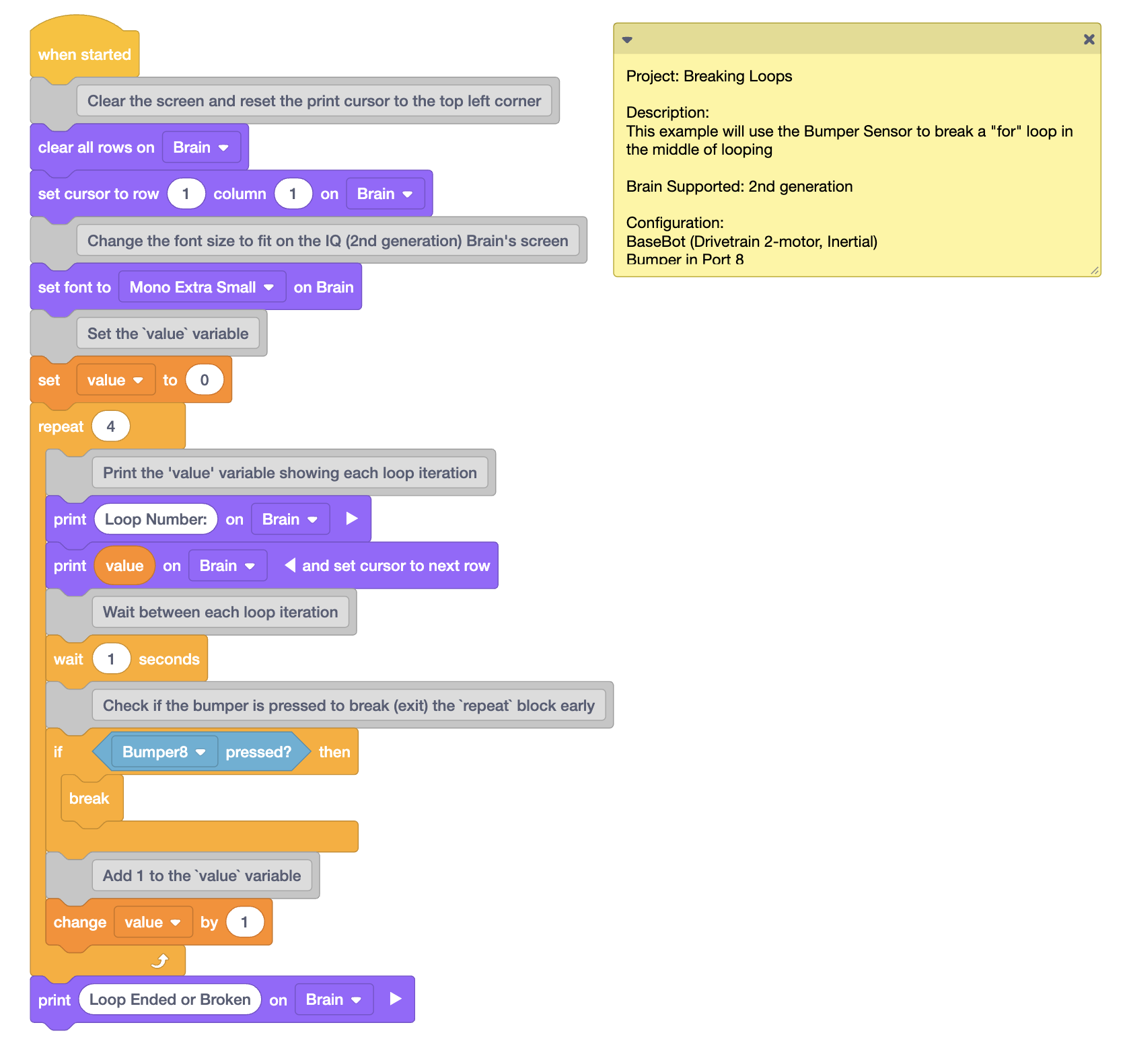 Thank you! It does help a little. I tried the Break- and looked at the samples as well. I added the breaks in with either the bumper or distance sensor. It worked sometimes. I have the bots build in the clawbot form and the optical light is turned on. I have found that turning my class lights off made it work more consistently. Isn’t that odd? Didn’t realize the sensors were that sensitive. Some still had issues getting away from the loop and completing code. I am not sure. In the sample code, with all the “print” code. Can you explain why that is used just to clarify my thoughts? Thank you for all the assistance!