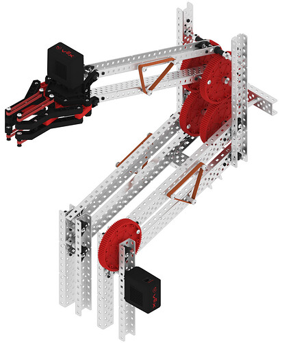 6.5. For 4-bar, 6-bar and 8-bar arms only: To more efficiently use the elastic bands (not rubber because all of the VEX supplied bands are actually silicone), a secondary point on the top bar of the 4-bar can be chosen such that a triangle can be made with the elastic band. Both the top points need to be closer to the bottom points when the arm is up than when it is down.