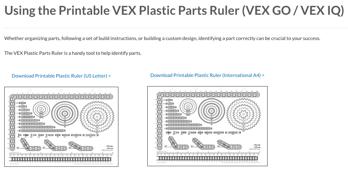 They are printable VEX Rulers to help students measure and identify different plastic and metal parts.