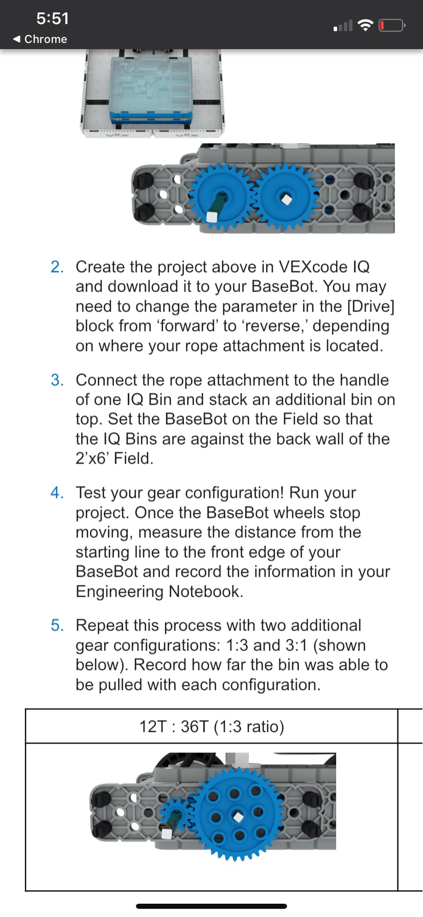 Hi @Barry_Carter_II! The closest “build instructions” we have are the images in that document. They’re less structured than normal build instructions as we were trying to facilitate building on your own. Building a 1:1 replica in this case is not necessary, as we only need a way to add two gears to progress in the STEM Lab. I’ve gone ahead and created these quick build instructions here that show how to create one half of the gear train for the BaseBot in the Tug-of-War STEM Lab. Let me know if this helps!