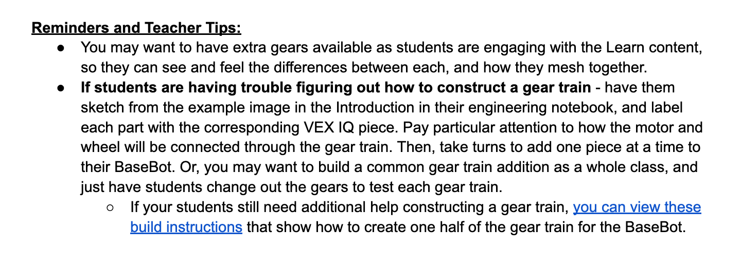 I cannot access the build instructions you posted above and I am having the same issue building the gear train. The practice activity is also not clear with the build and how to add it to the basebot. My students will be confused. Any further help?