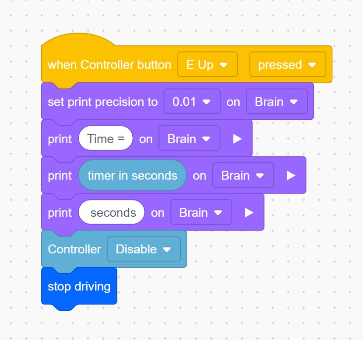 A {when pressed} controller event block can also use a controller button to stop the timer. However if this is used, I would suggest adding a [controller disabled] and a [stop driving] blocks. This prevents the driver from “accidentally” stopping the timer before they actually stop the run. If they stop the timer then they will not be able to drive the robot anymore. Here is an example using the controller’s E-up button to stop the timer: