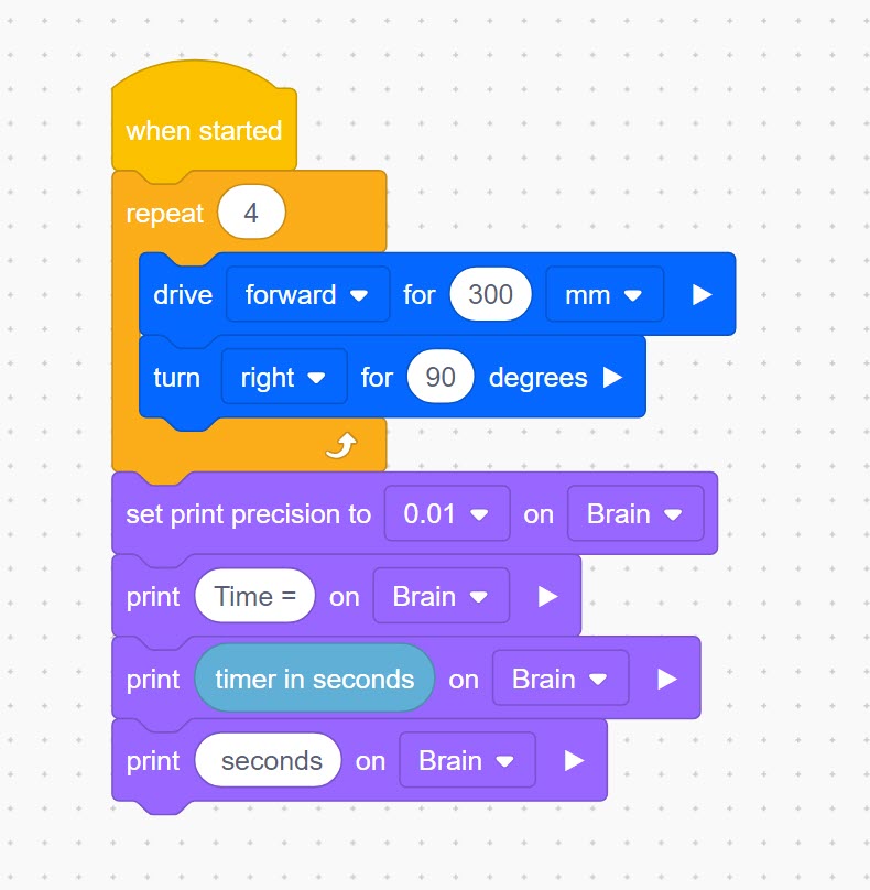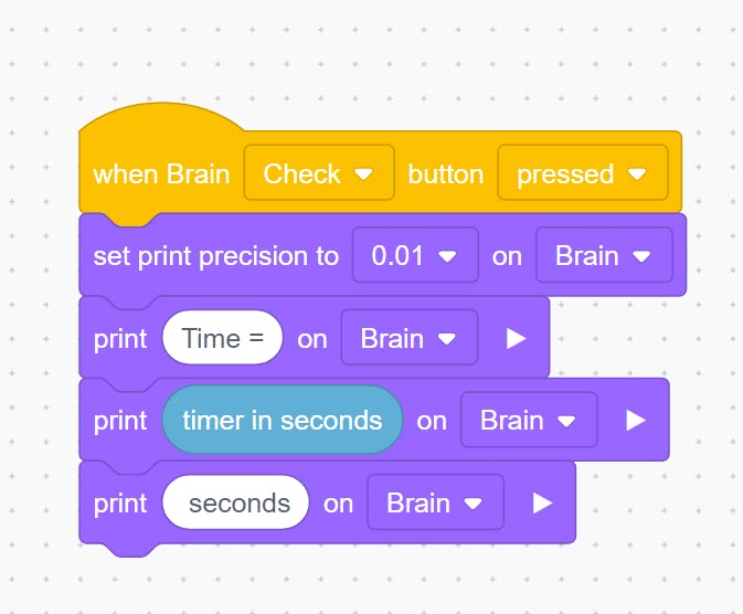 When the project requires driver control, you can have the time displayed on the Robot’s Brain by pressing one of the Robot Brain buttons. This can be done by adding a {when pressed} event block. Teams may find the fastest way to stop the timer for their run is to have a teammate ready to press the Robot Brain’s button instead of the driver having to put down the controller and press the button.