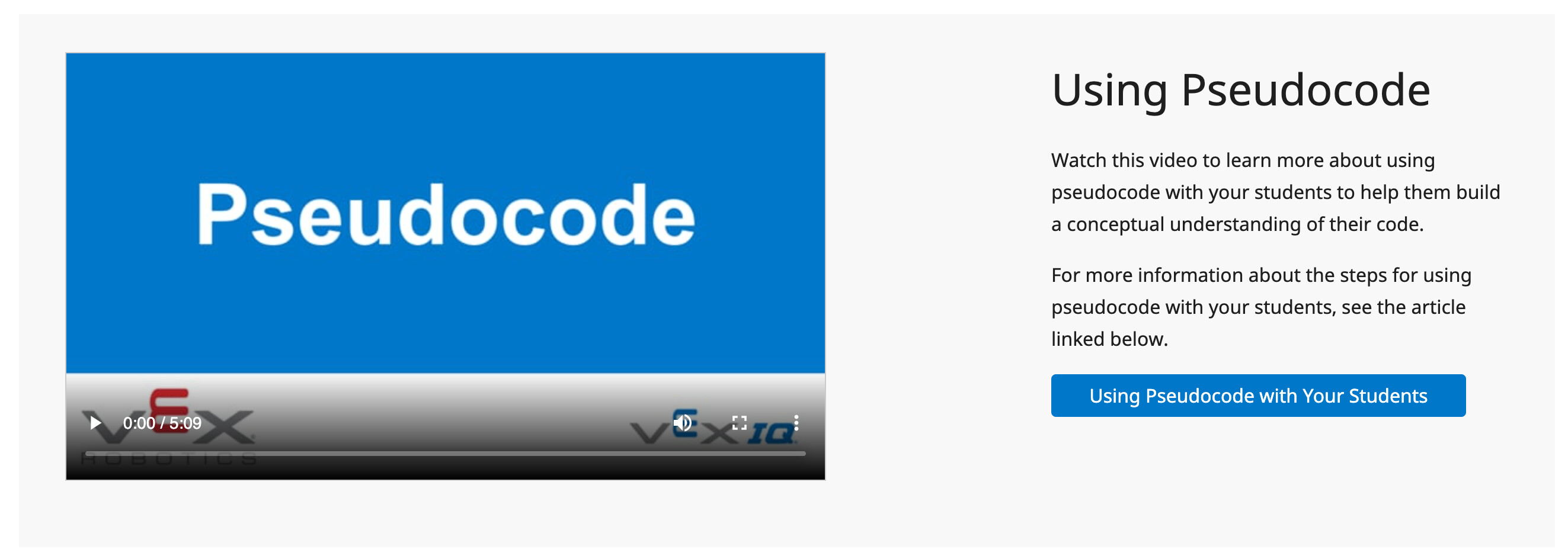 Here is the article if you want to see more about pseudocoding with your students! https://kb.vex.com/hc/en-us/articles/4409487290772-Using-Pseudocode-with-Your-Students